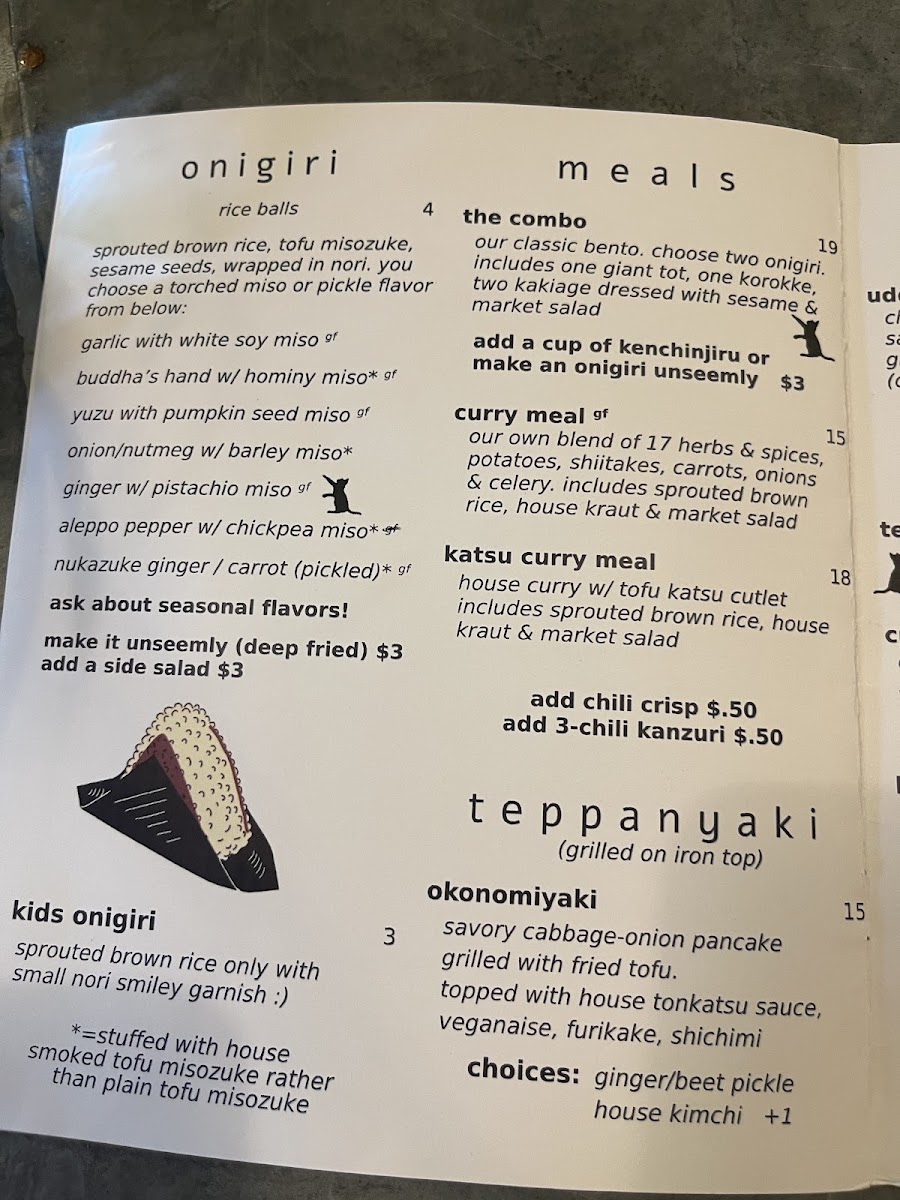 sprouted brown rice. inside: smoked house tofu misozuke. outside: toasted housemade purple barley/lentil miso blended with aleppo peppers. all wrapped in nori. add a sesame side salad for $2 or make it unseemly (deep fried!!) for $3 more.