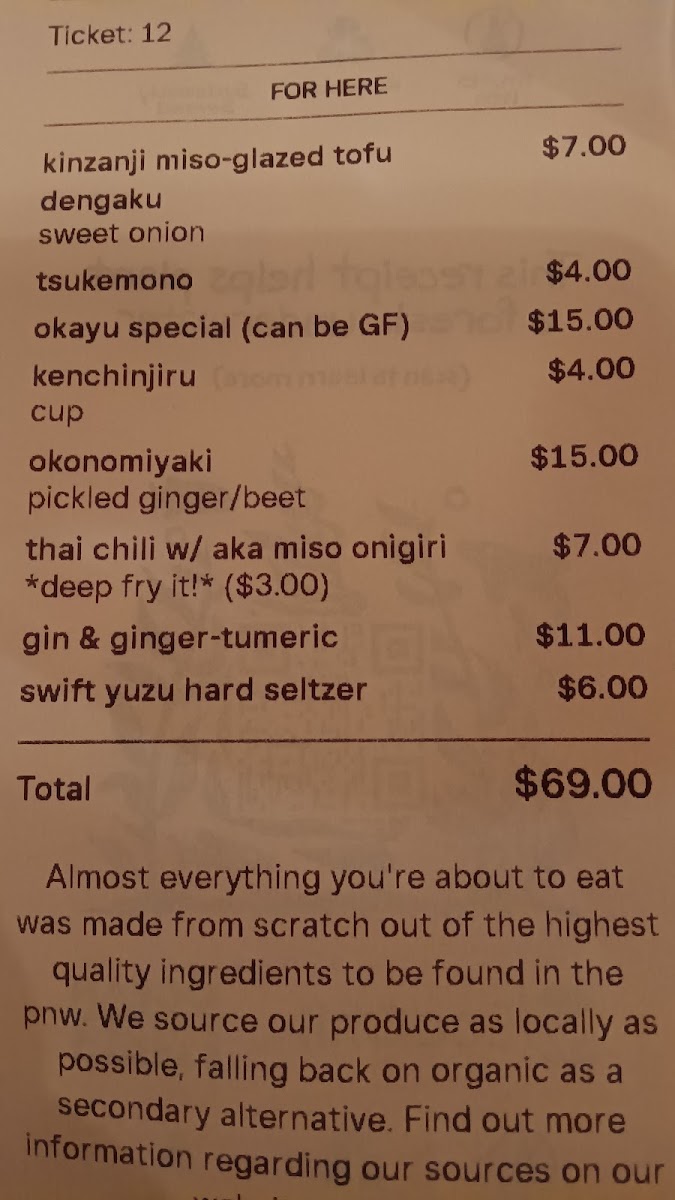 GF sprouted brown rice. inside: smoked house tofu misozuke. outside: toasted housemade brown rice & hominy miso blended w/ buddha’s hand citrus. wrapped w/ nori. add a sesame side salad or make it unseemly (deep fried!!) for $3 more.